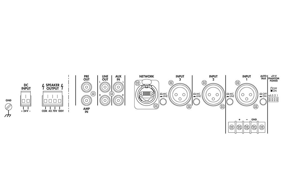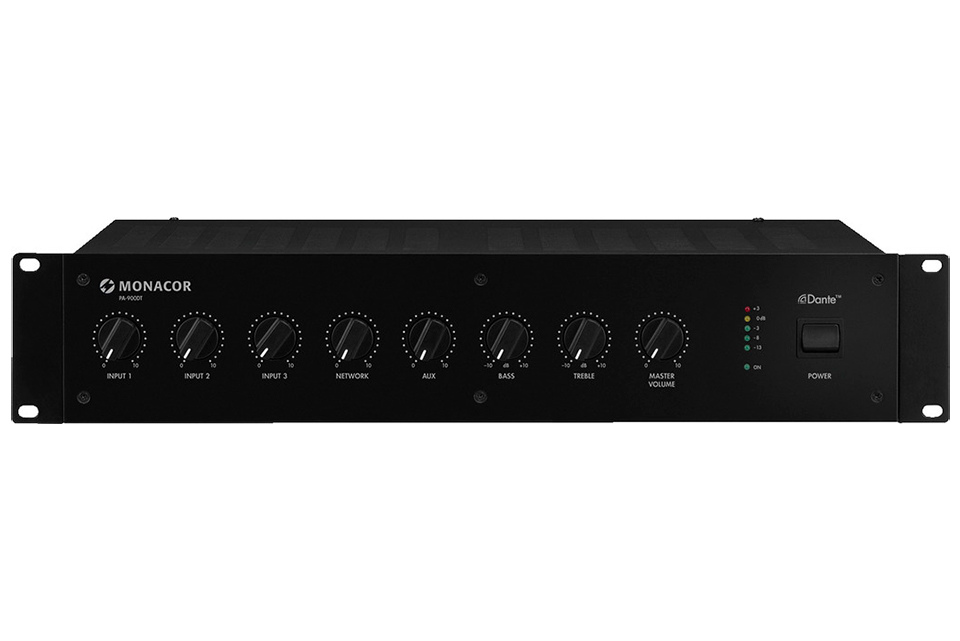 Highlights:• Integrated 2-channel Dante® module for digital audio streaming• 1 x 120 W amplifier with silent, fanless operation • 3 balanced mic/line inputs and 1 aux input • Priority and automatic talkover on Mic 1 • Supports both 230 V mains and 24 V emergency power supply • Insert connection for effects, EQs and feedback controllers • Compact 2 RU rack design with removable brackets • Ideal for professional integration into Dante® networks Digital Dante® Functionality With Analog Flexibility:With the addition of an integrated 2-channel Dante® module, the PA-900 and AKB-160 receive a significant upgrade that opens the door to digital audio distribution. Through an RJ45 connection, the unit can receive either one stereo signal or two mono signals, which are then converted into analog audio and amplified. This allows you to seamlessly connect existing analog speaker systems to a modern Dante® network—without compromising on sound quality or system stability. Perfect for installations in offices, schools, conference centers, and retail environments.Powerful and Silent Performance:This amplifier delivers 120 W RMS and a peak output power of up to 160 W. The compact chassis is designed for completely silent operation using a fanless cooling concept, making it a great choice for quiet environments such as meeting rooms, libraries, and houses of worship. The three balanced XLR inputs ensure professional-grade connectivity for microphones and other sources, while Mic 1 includes a priority circuit and talkover for clear speech transmission. The aux input allows easy connection of media players and external devices.Full Control and Versatile Features:With independent input and output level controls, 2-band tone control, and insert facilities, this amplifier offers outstanding flexibility. Each microphone input supports 20 V phantom power that can be individually activated, making the unit compatible with a wide range of microphones. Speaker connections are provided via screw terminals, and a separate line output allows for signal forwarding. The ability to operate on either 230 V mains or 24 V DC ensures reliable performance in both standard and emergency scenarios. Removable rack ears make it easy to install in AV racks and equipment cabinets.Specifications:• Output power: 1 x 120 W RMS• Power at 4 Ohm / 70 V / 100 V: 120 W • Peak output power: 160 W • Inputs: 3 x XLR (mic/line), 1 x RCA L/R (aux), 1 x RJ45 (Dante®) • Frequency response: 50 – 15,000 Hz • S/N ratio: > 80 dB • THD: < 0.5 % • Tone control: ±10 dB (bass/100 Hz, treble/10 kHz) • Phantom power: 20 V per mic input • Power supply: 230 V~ / 50 Hz / 300 VA or 24 V DC / 9 A • Operating temperature: 0 – 40 °C • Dimensions (W x H x D): 482 x 88 x 275 mm • Rack units: 2 RU • Weight: 10.53 kg Product reviews and links