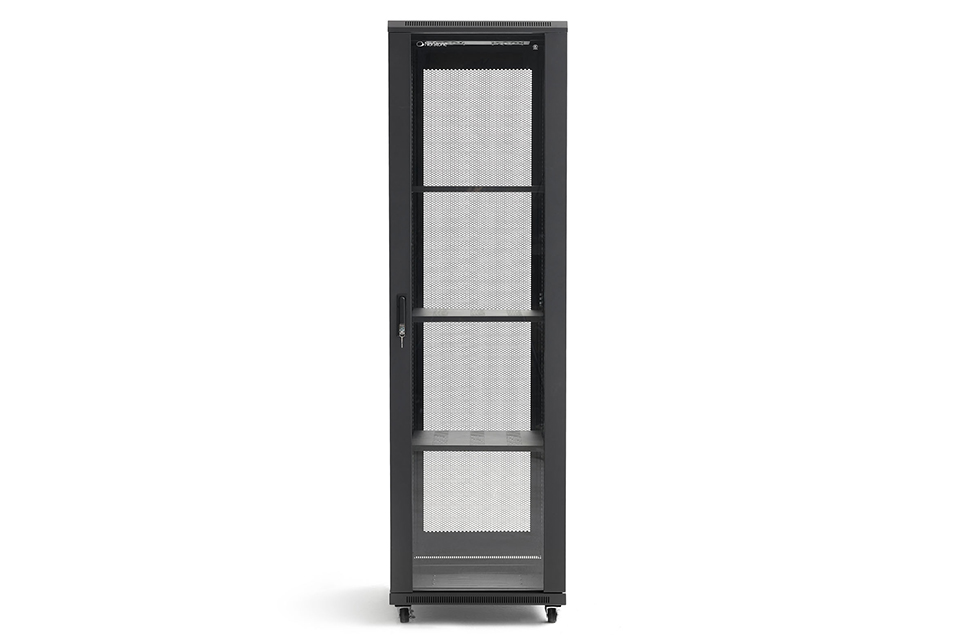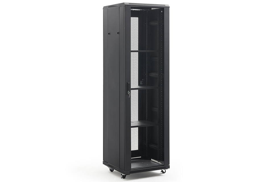 Highlights:• Holds up to 42 units of 19” equipment • Top-mounted ventilation grille with 2 integrated fans• 80 mm casters and adjustable feet included • Removable sides for easy installation and cabling • Front and rear profiles adjustable in depth (up to 540 mm) • Tempered glass door with key lock and butterfly handle • Reversible door for flexible access Large and robust rack cabinet for professional use:This 42U rack cabinet is designed to store and protect up to 42 units of 19” equipment efficiently and securely. Built from durable metal with a satin black finish, it combines strength with a sleek look that fits perfectly in server rooms and professional AV installations. The top features a ventilation grille and two integrated fans that help keep temperatures low and extend the lifespan of your equipment.Smart design for easy installation and access:To make installation and maintenance as easy as possible, the cabinet features removable side panels and front and rear profiles adjustable in depth up to 540 mm. The tempered glass door with key lock and butterfly handle provides both security and clear visibility of the equipment inside. The door can be reversed to suit the room layout.Flexible placement and transport:The cabinet comes with sturdy 80 mm casters and adjustable feet, making it easy to move or fix in place after installation. The included fixed shelves provide extra storage options, and its high load capacity makes it ideal for heavy professional equipment.Specifications:• Capacity: 42U (19” equipment)• Material: Metal • Color: Satin black • Ventilation: 2 integrated fans, top-mounted ventilation grille • Shelves: 3 fixed • Casters: 4 pcs, 80 mm • Feet: 4 adjustable • Door: Tempered glass, key lock with butterfly handle, reversible • Profiles: Adjustable front and rear, max depth 540 mm • Dimensions with casters (W x H x D): 600 x 2055 x 600 mm • Dimensions without casters (W x H x D): 600 x 1975 x 600 mm • Net weight: 68.8 kg • Delivery: Unassembled with screws, mounting instructions, and tools Product reviews and links