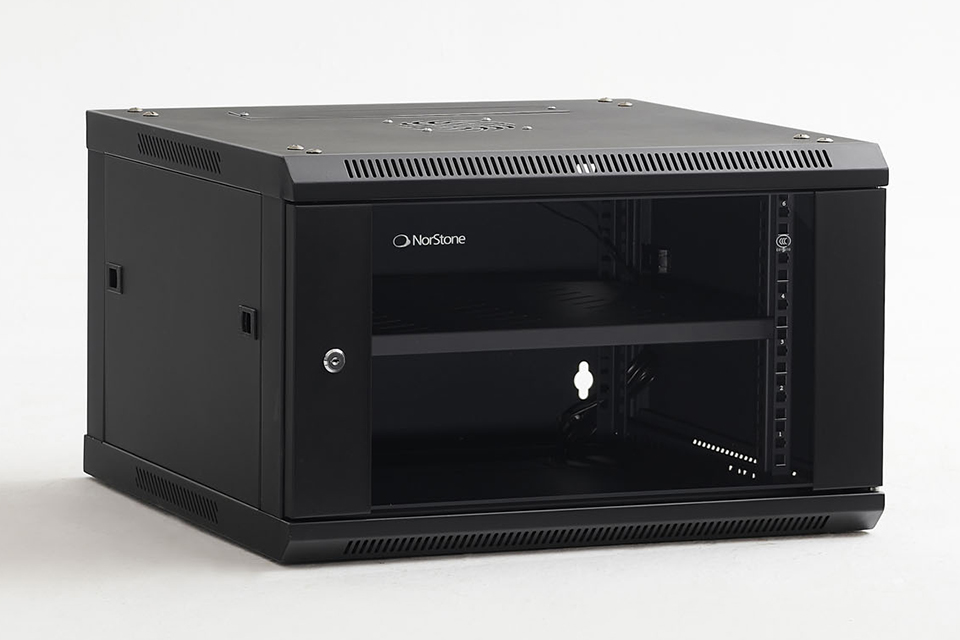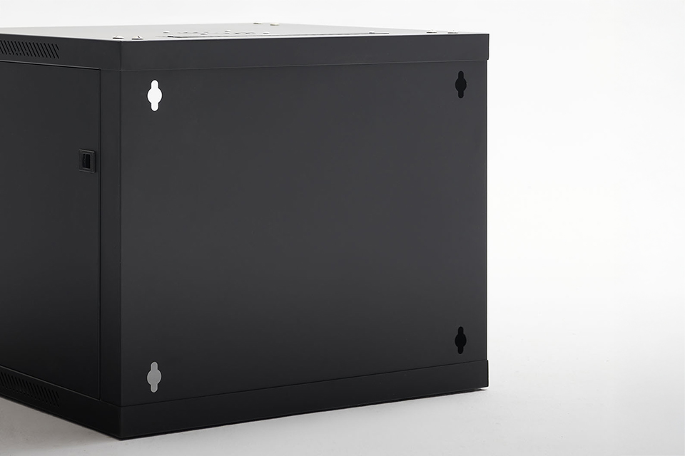 Highlights:• Holds up to 6 units in 19” format• Top-mounted ventilation grille with built-in fan • Removable side panels for easy installation and cabling • Tempered glass door with key lock • Depth-adjustable 19” profiles (up to 540 mm) • Multiple cable entries at top, bottom, and rear Compact rack solution for professional use:This wall-mounted rack cabinet offers a space-saving and practical solution for storing up to 6 units in the 19” standard size. With its sturdy metal construction and elegant satin black finish, it is ideal for both professional IT installations and office environments where equipment needs to be protected and organized. The removable side panels ensure easy access during installation and maintenance, while the front-mounted tempered glass door with key lock protects your equipment from unauthorized access.Optimal ventilation and flexible installation:To ensure optimal cooling, the cabinet features a top-mounted ventilation grille with an integrated fan that effectively dissipates heat from sensitive electronics. The depth-adjustable 19” profiles offer flexibility for different types of equipment, while cable entries at the top, bottom, and rear make installation adaptable to your needs. All cable openings can be closed to protect against dust.Specifications:• Material: Metal• Color: Satin black • Height: 6 U • Fan: 1 top-mounted • Fixed shelf: 1 • Max usable depth: 540 mm • Dimensions (W x H x D): 600 x 370 x 600 mm • Net weight: 19 kg • Delivered unassembled with screws, mounting instructions, and tools • Package dimensions (W x H x D): 640 x 245 x 650 mm • Gross weight: 20.8 kg Product reviews and links