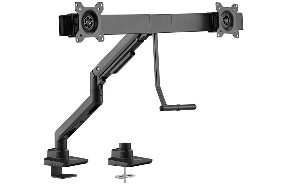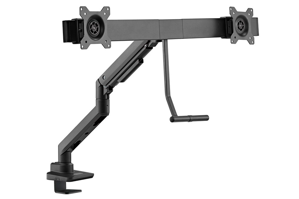 Highlights:• Ergonomic solution for two screens from 17 to 32 inches• Smooth and effortless movement with gas pressure spring • Synchronous adjustment of both screens via practical handle • Integrated cable management for a tidy workspace • Stable mounting with desk clamp or screw fixing • Compatible with VESA 75x75 mm and 100x100 mm Ergonomic workstation with dual mount:This dual monitor mount is the ideal choice for an ergonomic office setup where two screens are used effectively and comfortably. With the practical handle, both screens can be adjusted synchronously so they always remain parallel. The gas pressure spring ensures that all movements are smooth and effortless. The integrated cable management system keeps everything neat and professional, making the solution both functional and stylish.Space-saving and stable installation:Designed for professional and demanding environments, this mount is equally suitable for the home office. The robust construction in metal and aluminum provides maximum stability, while the slim base saves valuable desk space. Compatible with VESA standards, the mount can be quickly and easily installed with the included desk clamp or secured with screws. The screens can be tilted, rotated, and height-adjusted so you can always achieve the perfect working position.Specifications:• Bracket type: Dual monitor• Screen size: 17-32" (43-81 cm) • Maximum load: 9 kg per screen • VESA standard: 75x75 mm, 100x100 mm • Rotation: 180° • Tilt: ±10° • Swivel: ±10° • Material: Aluminum, steel • Color: Black • Recommended tabletop thickness: 12-50 mm • Width: 818 mm • Height: 619 mm • Depth: 579 mm