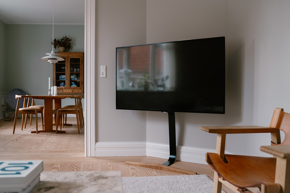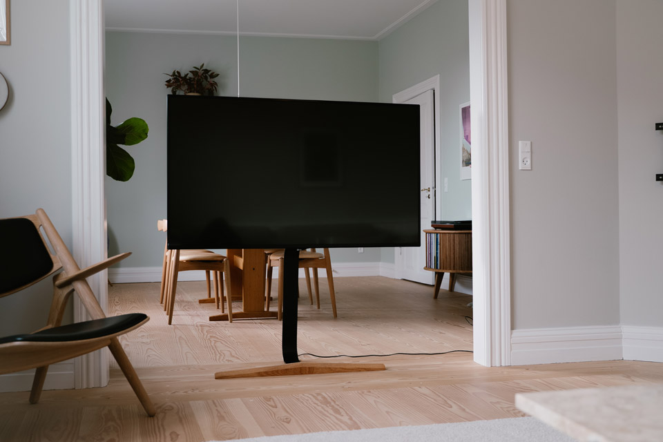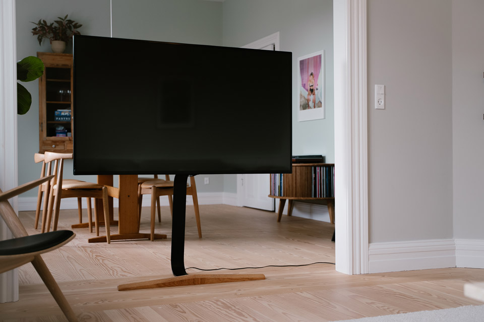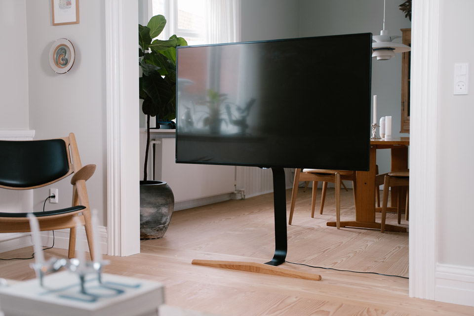 Highlights:• Elegant TV stand with a solid oak base• Smooth swivel function for flexible positioning • Hidden cable management for a tidy look • Minimalistic and timeless design • Solid construction in steel with load capacity up to 30 kg • Suitable for TVs from 40 to 70 inches Natural elegance in solid wood:NOMI is designed to be more than just a functional TV stand. It combines practical features with aesthetic harmony, adding a modern and inviting touch to any room. The base is made of solid oak, which with its natural warmth and texture creates a beautiful and harmonious element in the interior. The minimalist steel structure reinforces the light appearance while ensuring strength and stability. The wood is treated with clear oil that enhances the grain and gives it a natural glow.Flexibility with swivel function:With Kristian Juul NOMI you get more than just a fixed piece of furniture. The swivel function allows you to adjust the screen angle for different situations, whether you are watching TV from the sofa, dining table, or bed. The integrated cable cover at the back ensures that cables remain hidden, keeping your home neat and stylish. NOMI from Kristian Juul is therefore both a functional and elegant solution, perfectly suited for the living room, office, or bedroom.Specifications:• Material: Solid oak and powder-coated steel• Surface treatment: Clear oil • Height: 1160 mm • Width: 800 mm • Depth: 360 mm • Load capacity: Up to 30 kg • VESA standard: 200, 300 and 400 • Recommended TV size: 40 to 70 inches