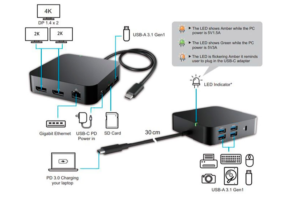 Highlights:• Supports up to two 2K displays or one 4K display via DisplayPort• Power delivery up to 85W via USB-C PD • 5 high-speed USB 3.2 ports for multiple device connections • Gigabit Ethernet port for stable network performance • Built-in SD card reader for quick data transfers • Compatible with both Windows and macOS • Compact design made from durable black ABS plastic Complete control with a single USB-C connection:The Gearlab Dual 2K Mini Dock makes it easy to transform your laptop into a full workstation. With just one USB-C cable, you gain access to dual DisplayPort outputs, fast USB 3.2 ports, an SD card reader, and reliable gigabit Ethernet connectivity. The dock supports two 2K displays or one 4K monitor, offering great flexibility for your setup. Perfect for office use, home workstations, or mobile setups where efficiency and organization are key.High-quality design and performance:This compact mini dock is built from sturdy ABS material that protects your electronics while keeping the weight low. With USB Power Delivery 3.0, it provides up to 85W charging to your laptop, allowing you to work without worrying about battery life. The five USB 3.2 ports offer fast access to peripherals such as keyboards, mice, and external drives, while the integrated SD card reader ensures quick file transfers. The Gearlab Dual 2K Mini Dock is the ideal choice for users who want to maximize productivity both on the go and at their desk.Specifications:• Connection type: USB 3.2 Gen 1 Type-C• Supported displays: 2x 2K monitors (1920x1080p) or 1x 4K (via DisplayPort 1.4) • DisplayPorts: 2 pcs • USB ports: 5 x USB 3.2 Type-A • Ethernet: 1 x RJ-45 (10/100/1000 Mbit/s) • Card reader: SD/SDHC/SDXC • Power delivery: Up to 85W (USB PD 3.0) • Material: ABS plastic • Compatibility: Windows and macOS • Dimensions: 10 x 10 x 2.7 cm • Weight: 0.09 kg • Color: Black Product reviews and links
