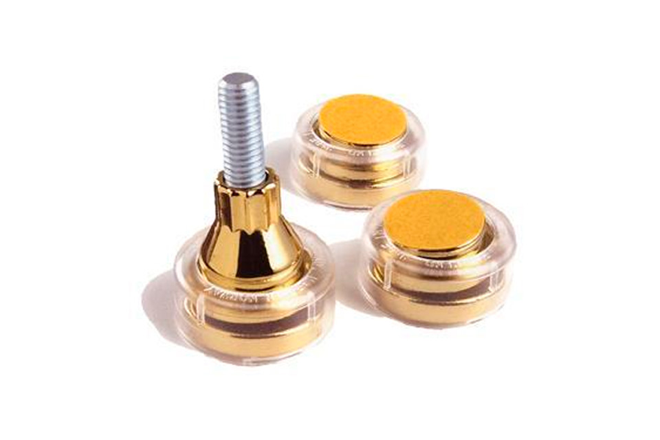 Exclusive high-end spikes with gold finish. Handcrafted design with 5/16", 7,94 mm thread in a 4-pack, combining luxury looks, stability, and improved sound.