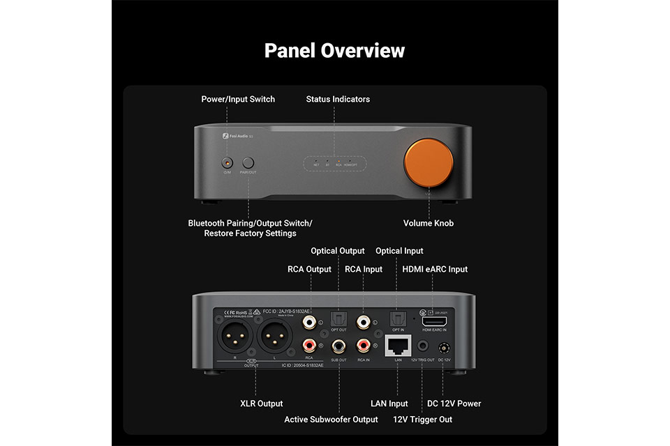 Highlights:• Streamer, DAC and preamp in one compact unit• Supports TIDAL Connect, Spotify Connect, AirPlay 2, Google Cast, DLNA and Roon Ready • Balanced XLR outputs and RCA for flexible connectivity • HDMI eARC makes it ideal for both music and TV audio • Dual-band Wi-Fi 6 and Bluetooth 5.3 for stable wireless streaming • 5-band EQ and app control via Fosi Audio App • Subwoofer output for easy 2.1 system setup • AKM4493SEQ DAC and OPA1612 op-amps in a balanced circuit Compact Streaming Hub for Modern HiFi and TV Audio:Fosi Audio S3 is a versatile solution for those who want streaming, digital conversion and preamplification combined in a single unit. This makes it an excellent choice for HiFi systems, TV setups and combined music and AV installations where space, flexibility and ease of use are key priorities. With its compact chassis, it fits easily into shelves, TV furniture and rack environments while still offering features typically found in larger and more advanced devices. The S3 acts as a central hub between your digital audio sources, streaming services and sound system, ensuring a clean and efficient signal path with high usability in everyday listening.Streaming, Connectivity and High Quality Audio:With support for TIDAL Connect, Spotify Connect, AirPlay 2, Google Cast, DLNA and Roon Ready, the S3 is prepared for virtually any modern streaming scenario. You can stream directly from your favorite apps and enjoy a stable and intuitive user experience. Dual-band Wi-Fi 6 and Bluetooth 5.3 provide flexible wireless connectivity, while Ethernet ensures a stable wired network connection. The balanced audio section featuring the Amlogic A113X platform, AKM4493SEQ DAC chip and OPA1612 op-amps delivers clean and accurate sound reproduction. With balanced XLR outputs, RCA, HDMI eARC, optical input and a dedicated subwoofer output, the unit is perfectly suited as the centerpiece in both stereo and 2.1 systems. Through the Fosi Audio App, you can control playback, switch inputs and fine-tune the sound using the built-in 5-band EQ for optimal performance in any setup.Specifications:• Functions: Streamer, DAC and preamp• Streaming protocols: Google Cast, AirPlay 2, DLNA, Roon Ready, Spotify Connect, TIDAL Connect • Network: 802.11 a/b/g/n/ac/ax dual-band Wi-Fi 2.4 GHz / 5 GHz • Ethernet: 10/100M • Bluetooth: 5.3 • Bluetooth codecs: SBC, AAC • DAC chip: AKM4493SEQ • Streaming platform: Amlogic A113X • Op-amps: OPA1612 • Outputs: Balanced XLR, RCA, subwoofer output • Inputs: HDMI eARC, optical • Resolution via optical, HDMI and Wi-Fi: Up to PCM 24-bit/192 kHz • Resolution via Roon Ready: Up to PCM 32-bit/384 kHz • THD+N: Down to 0.00018 % • Signal-to-noise ratio: Up to 120 dB • EQ: 5-band EQ via app • Dimensions: 4.7 x 17.3 x 17.3 cm