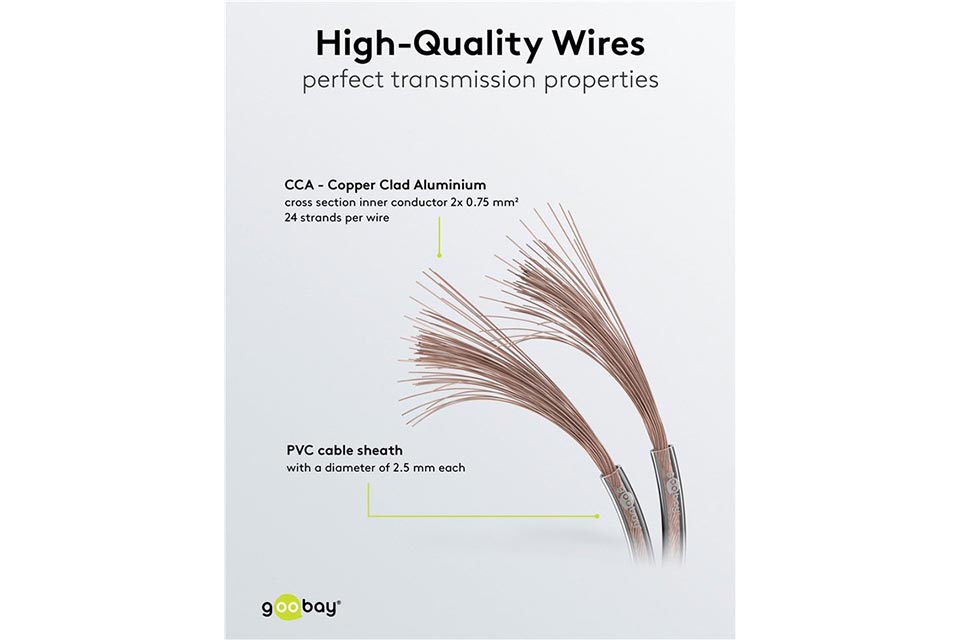 The cable is constructed with CCA conductors, combining aluminium and copper to provide good transmission properties. This ensures a reliable connection between your audio equipment, whether used for music, movies or gaming. The clear polarity marking makes it easy to achieve correct installation, which is essential for optimal sound quality.